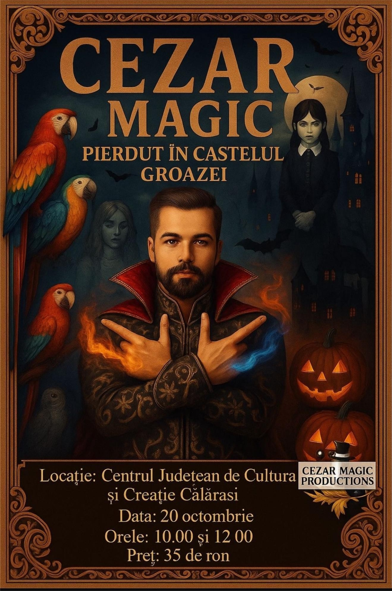 spectacol interactiv de magie dedicat întregii familii! Personaje fascinante – Cezar Magic, Paznicul Corb, Wednesday, Contele